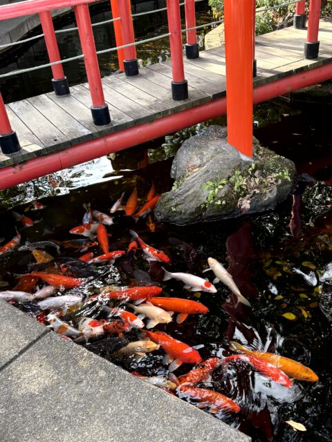 しばらく歩いて二宮町が近くなると、六所神社がありました。既に足が痛くなってきていて、さらに国道1号から200メートルほど入るので躊躇したのですが、相模國総社をスルーはできませんのでお参りさせていただきました。参道横の池にはきれいな鯉がいました。