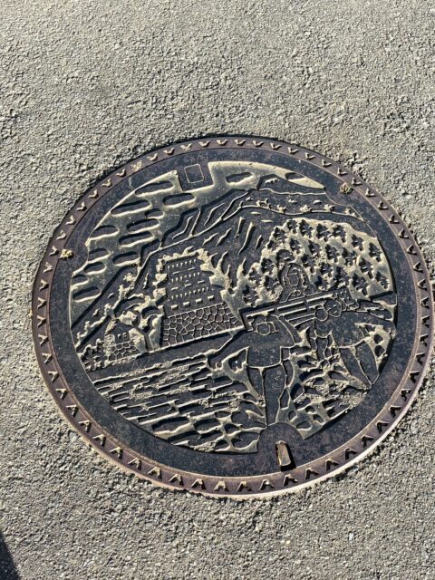 小田原市のマンホールは『箱根山/富士山』『小田原城』そして『酒匂川の渡し』です。男の人がふんどしで何か担いでいるので「小田原のお祭り?」と思ったのですが、調べてみたら酒匂川の渡しでした。