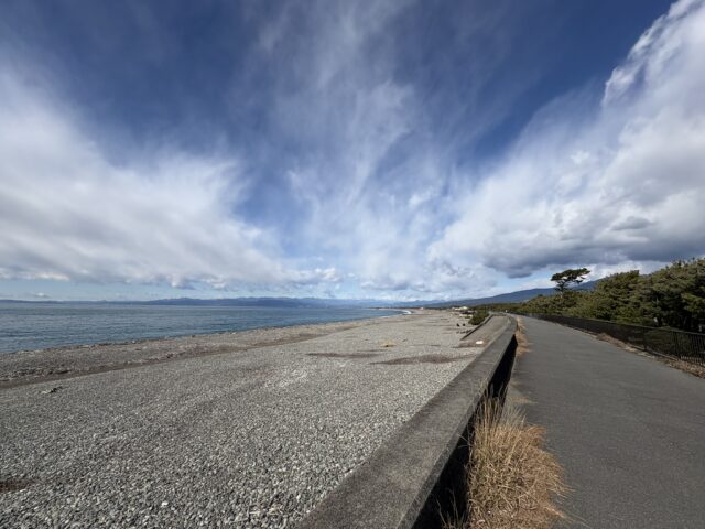 ここが駿河湾ってやつですね。前に歩いた日光街道やこの旧東海道の旅で松の木は見慣れていたのですが、富士山と海と一緒に見るとまた格別です。とても気持ちが良いです。富士山もよく見えたのですが、頂上付近に少しだけ雲がかかってますね。