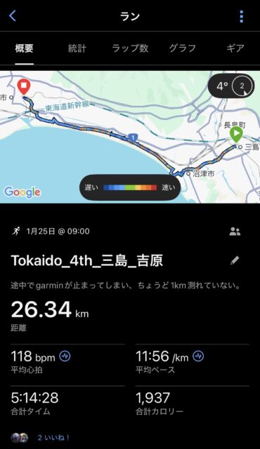 - 吉原宿に入る前にGarminが止まってしまい、ちょうど1km測れていない。