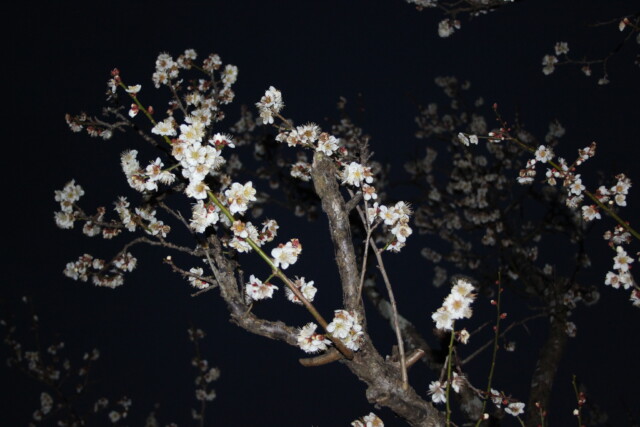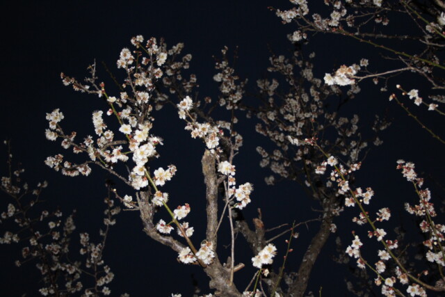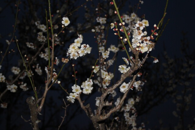 夜梅 日常生活 X Facebook はてブ LINE Pinterest コピー 2026.02.14 自宅から車で10分くらいのところにある『甚兵衛公園』の梅が咲き始めているとのことなので、夜梅を撮ってきました。設定はいろいろやってみたんだけど、うまく撮れず、結局は「AUTO」。 夜は難しいですね。