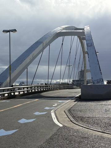 国道をひたすら進むと、六郷橋にさしかかります。こちらも箱根駅伝でお馴染み。1区のランナーのラストスパートが展開される橋ですね。駅伝見てるとふつうに渡れると思っていたのですが、車以外はここから螺旋階段を上ります。
