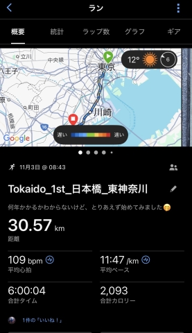 最初は10分/キロを切るペース。順調、順調。